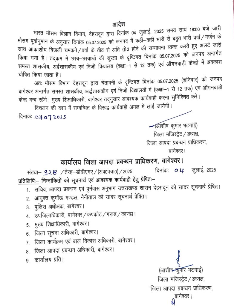 भारत मौसम विज्ञान विभाग, देहरादून द्वारा दिनांक 04 जुलाई, 2025 को जारी मौसम पूर्वानुमान के अनुसार जनपद बागेश्वर में दिनांक 05 जुलाई, 2025 (शनिवार) को कहीं-कहीं भारी से बहुत भारी वर्षा/गर्जन के साथ आकाशीय बिजली गिरने की संभावना व्यक्त की गई है। संभावित आपदा की गंभीरता को देखते हुए जिलाधिकारी आशीष भटगाईं द्वारा जनपद के समस्त शासकीय, अशासकीय एवं निजी विद्यालय (कक्षा 1 से 12 तक) एवं आंगनबाड़ी केंद्रों में एक दिवसीय अवकाश घोषित किया गया है।