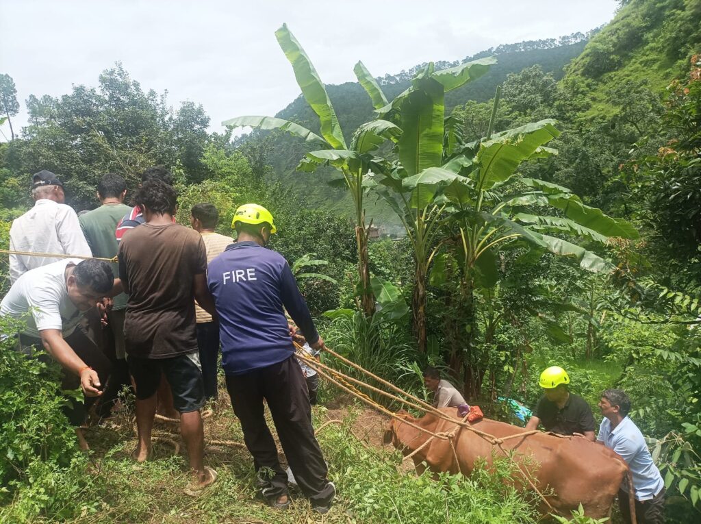 दूसरी घटना बिलौना क्षेत्र के पास की है, जहां एक गाय सड़क से करीब 10–12 फीट गहरी खाई में गिर गई थी। यह स्थान काफी दुर्गम और चुनौतीपूर्ण था, जिससे रेस्क्यू करना आसान नहीं था। लेकिन फायर टीम ने यहां भी हार नहीं मानी। पहले स्थिति का आकलन किया गया और फिर एनिमल स्केप तकनीक का उपयोग कर जेसीबी मशीन की सहायता से गाय को धीरे-धीरे ऊपर लाया गया। इस ऑपरेशन में स्थानीय ग्रामीणों ने भी पूरी मदद की। मौके पर मौजूद पशु चिकित्सकों ने गाय की प्राथमिक जांच की और फिर उसे सुरक्षित मालिक को सौंप दिया गया।