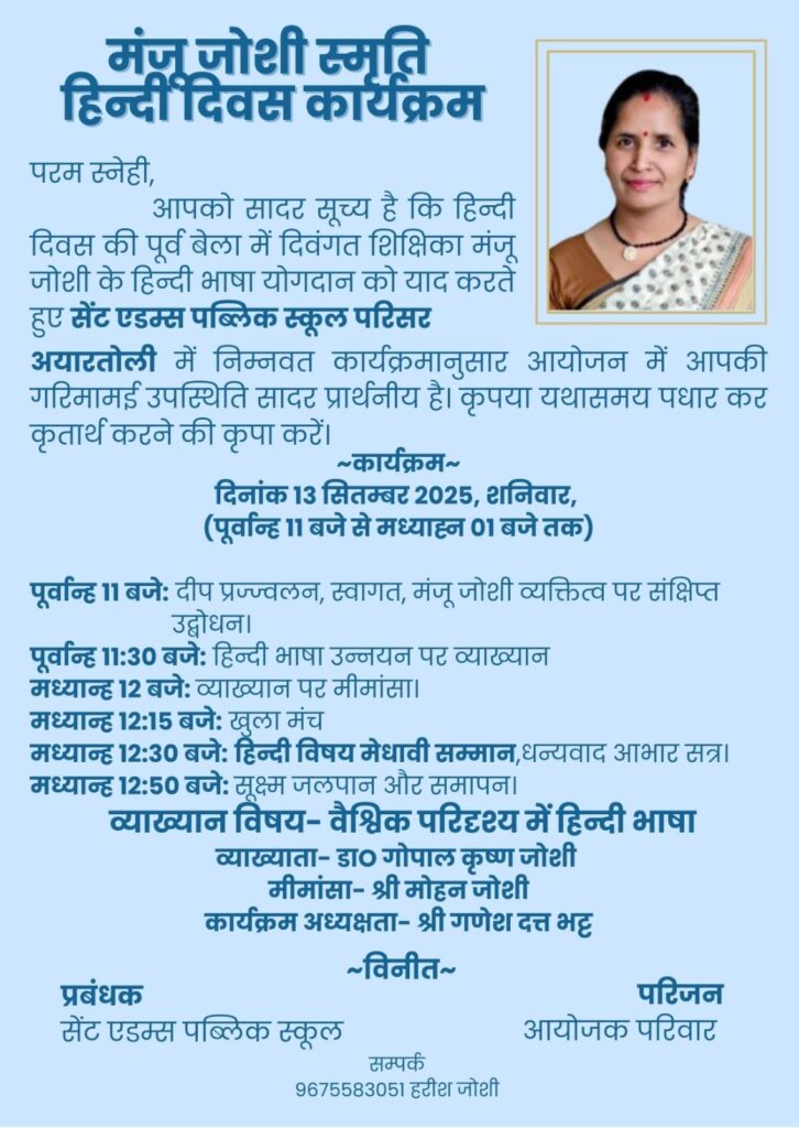 आज की खबर गरुड़ क्षेत्र से है, जहां हिन्दी दिवस इस बार एक भावुक याद के साथ जुड़ने वाला है। सेंट एडम्स पब्लिक स्कूल अयारतोली में 13 सितम्बर 2025 को हिन्दी दिवस की पूर्व बेला में महत्वपूर्ण आयोजन दिवंगत शिक्षिका मंजू जोशी की स्मृति में किया जाएगा।