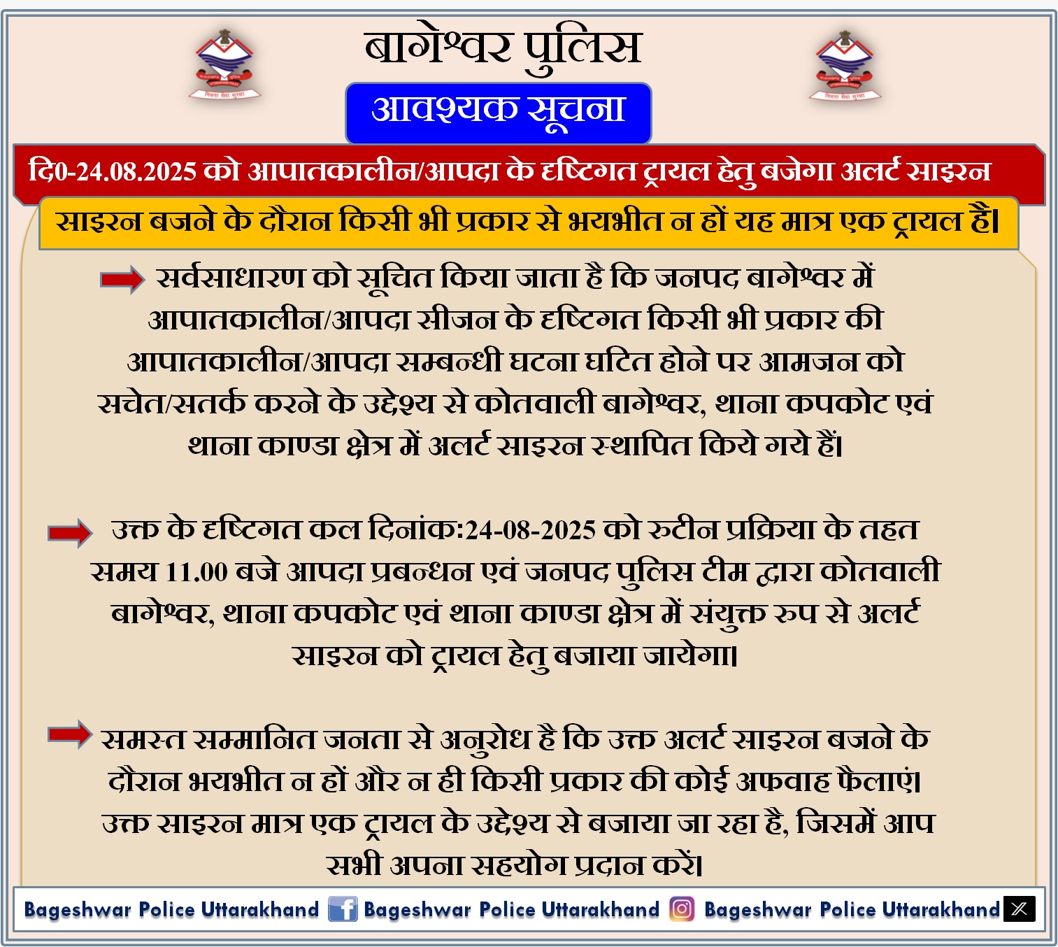 जनपद बागेश्वर पुलिस ने 24 अगस्त 2025 को आपदा/आपातकालीन स्थिति के परीक्षण के लिए अलर्ट साइरन बजाने की सूचना जारी की है। पुलिस द्वारा स्पष्ट किया गया है कि यह साइरन केवल ट्रायल हेतु बजाया जाएगा – आम जनता को किसी भी प्रकार से भयभीत होने की आवश्यकता नहीं है।