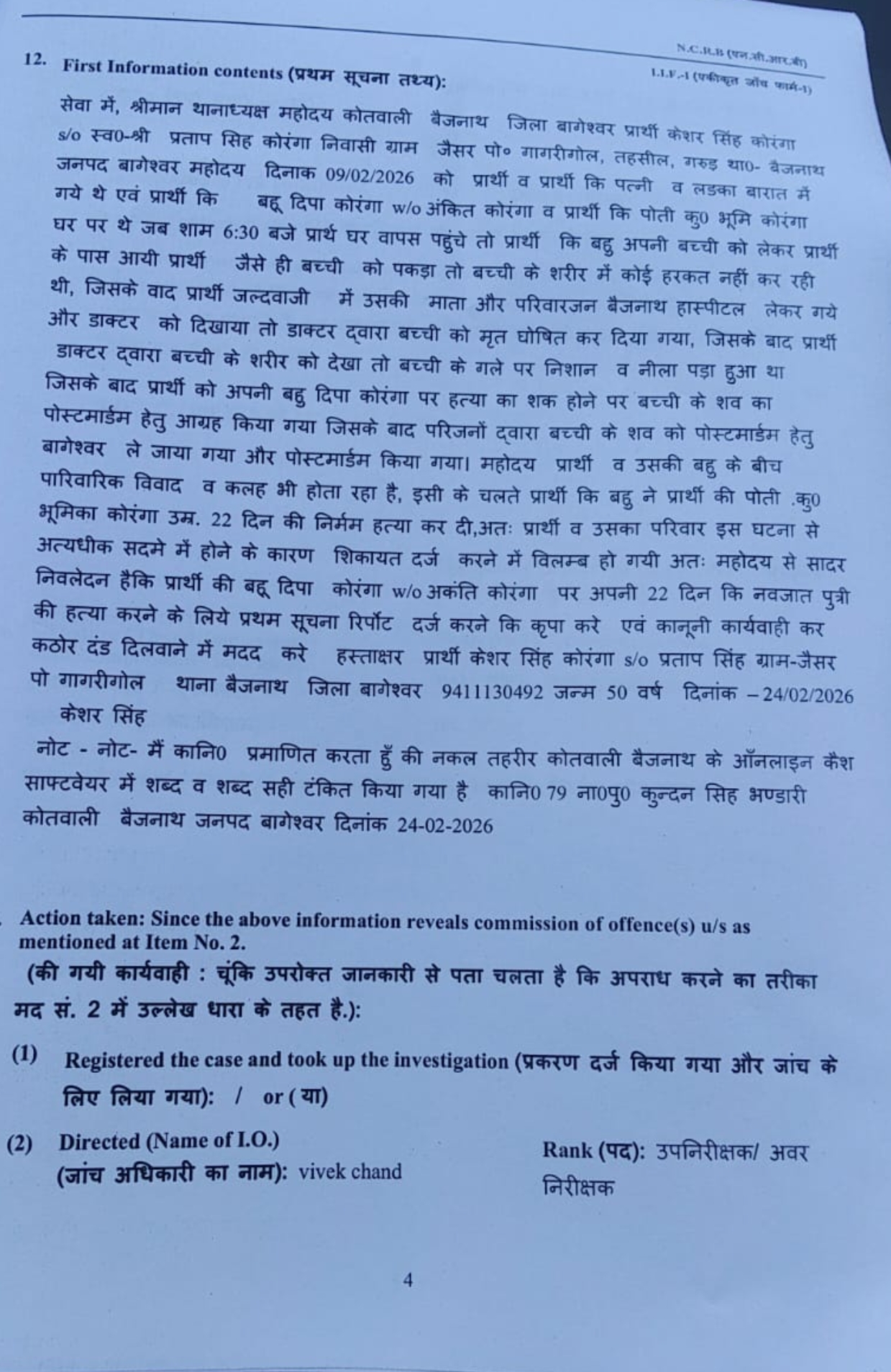 बच्ची के दादा केसर सिंह कोरंगा के अनुसार 9 फरवरी 2026 को जब परिवार के सदस्य अपने दैनिक कार्यों में व्यस्त थे। शाम लगभग साढ़े छह बजे जब बच्ची के दादा घर लौटे तो घर का माहौल सामान्य दिखाई दिया। बताया गया कि बहू अपनी बच्ची को लेकर उनके पास आई। जैसे ही उन्होंने बच्ची को गोद में लिया, उन्हें बच्ची के शरीर में कोई हरकत महसूस नहीं हुई। यह देख परिवार के सभी लोग घबरा गए और तुरंत बच्ची को उपचार के लिए अस्पताल ले जाया गया।